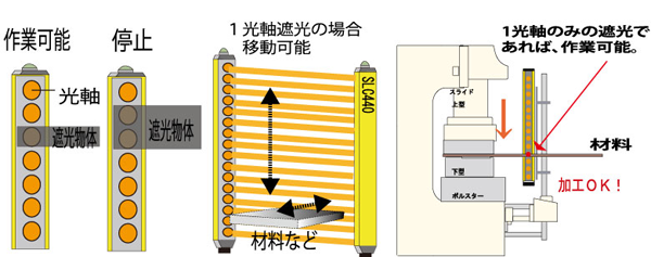 材料の挿入角度やたわみ等により、遮光する幅は変化します。また、手などが危険エリアに入れば、2光軸以上遮光されるので急停止します。小物・箱曲加工のないプレスブレーキなどにもお勧めです。