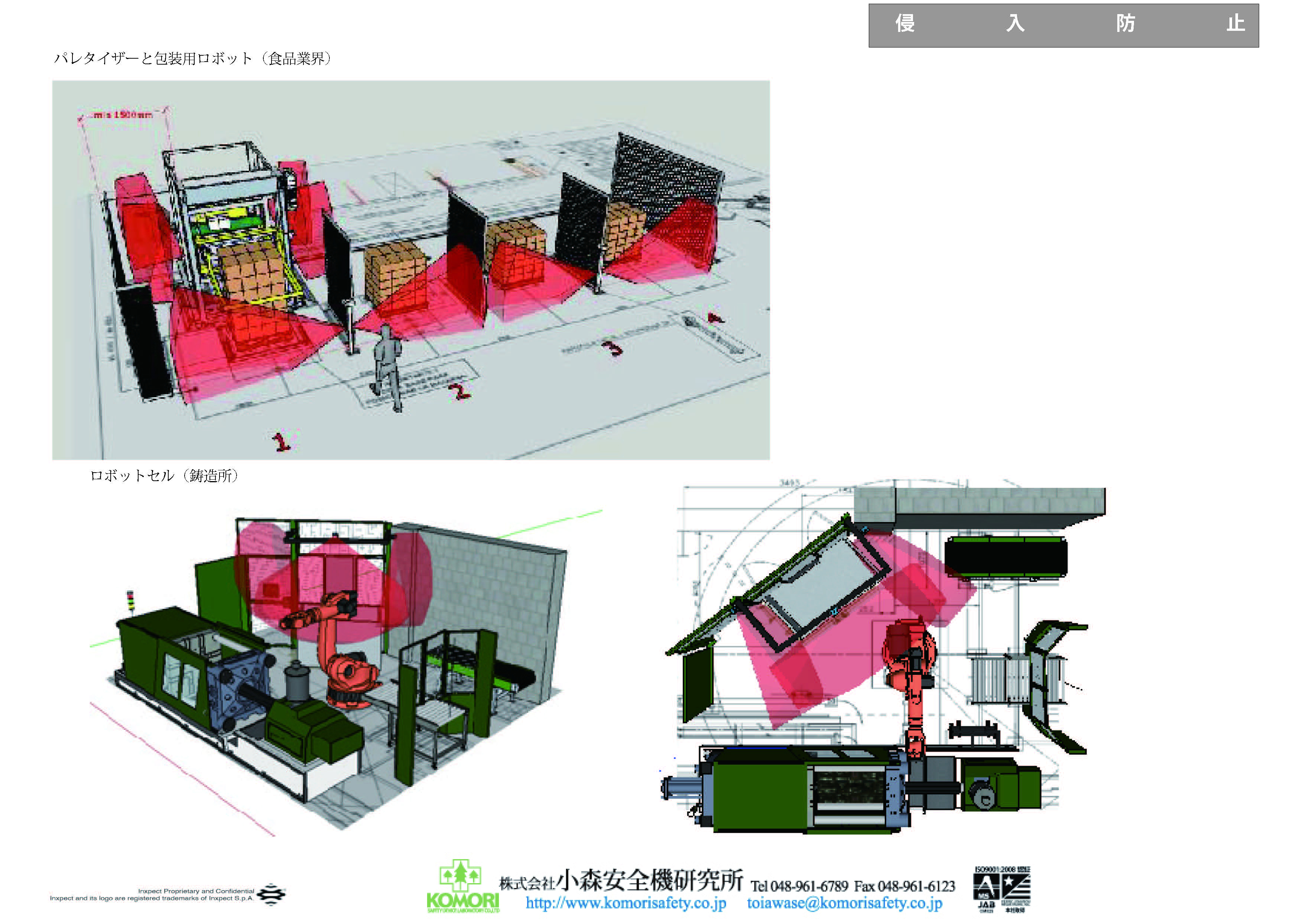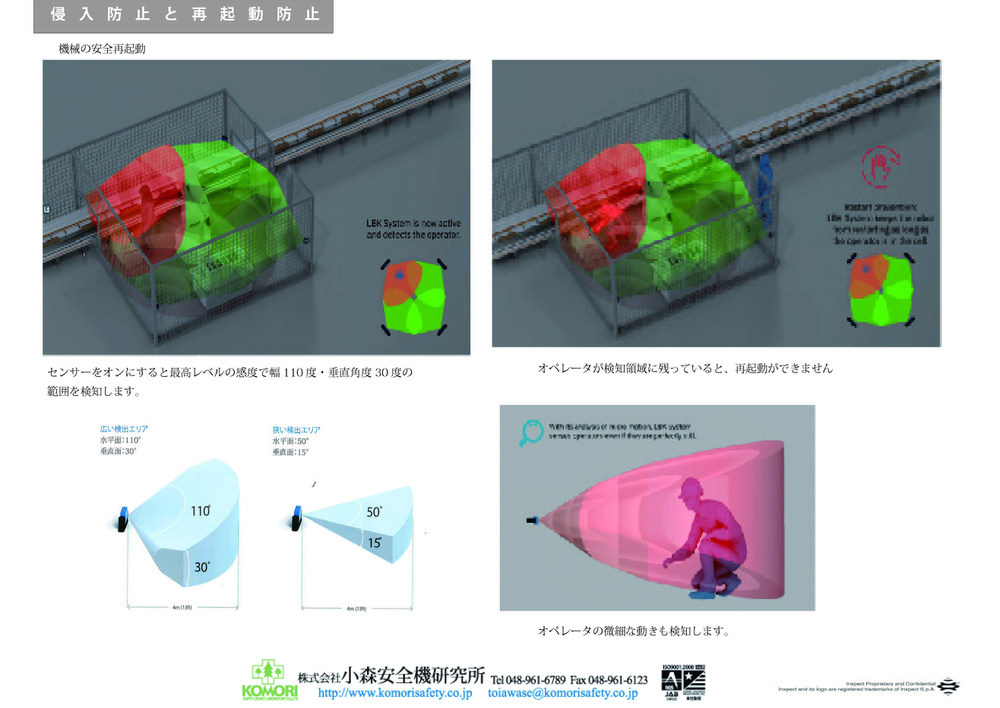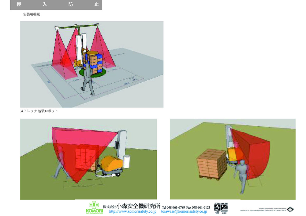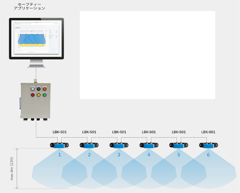 ロボセーフはSRD センサー(100または,200シリーズ) とKOMORI独自のコントロールボックスで構成され、制御する機器の出力に接続するだけで運用が可能なため、設置が簡単です。検出ゾーンの設定もアプリケーションでPCで設定可能です。