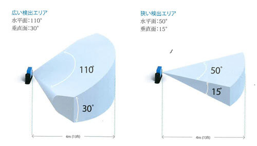 | 検出エリアと設置高 | 広い検出範囲:110°水平30°垂直、高さ:0~3 m(0~9.8ft) 狭い検出範囲:50° 水平15°垂直、高さ:O~3 m (0~9.8 ft |