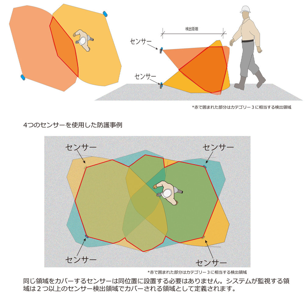 ・少なくとも2つのセンサが同じ危険領域を同時に監視する必要があります。