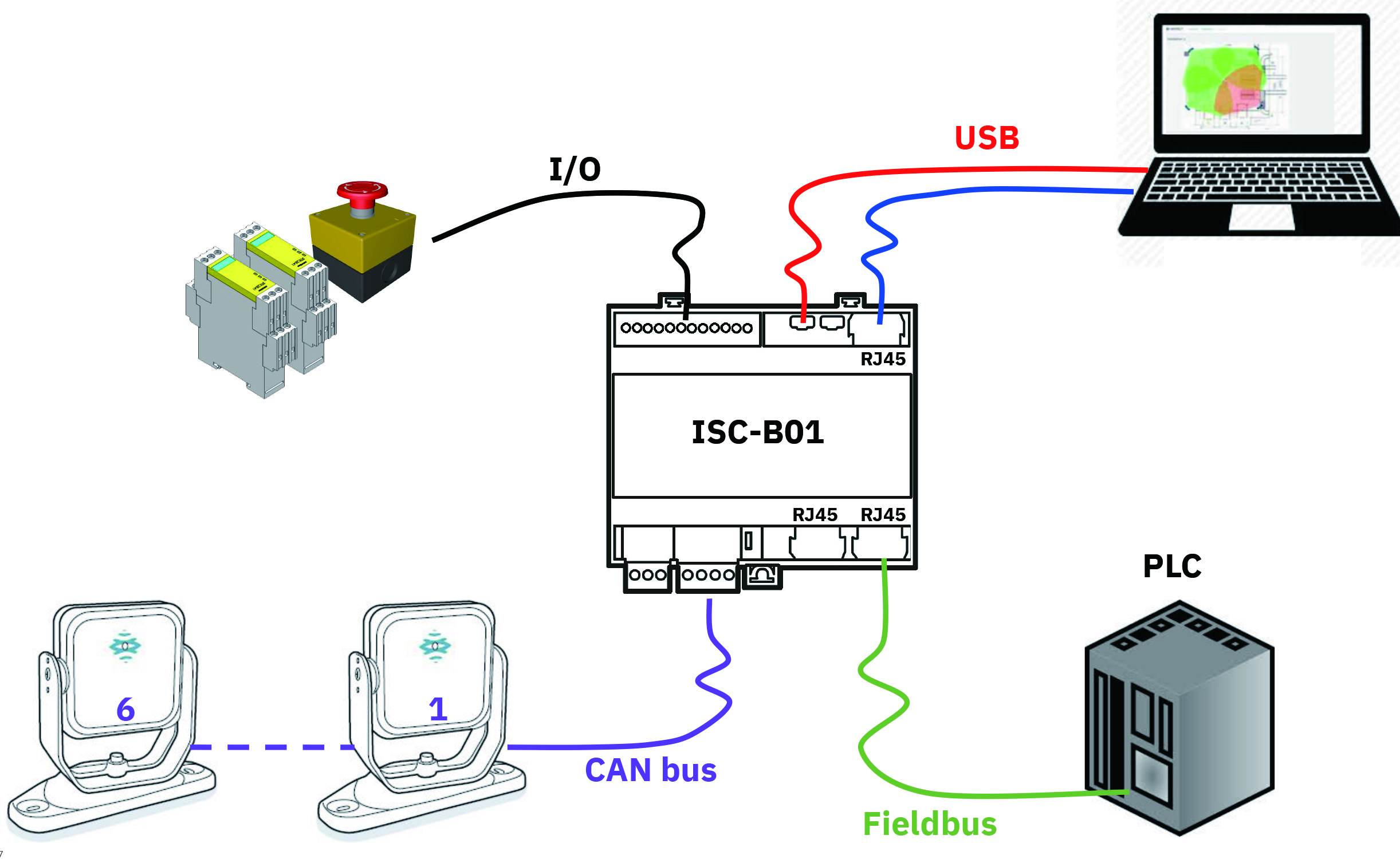ISC-B01コントローラーを使用することで、少なくとも2つのセンサーが同じ危険領域を同時に監視することで安全性が高まります。(カテゴリー3の構成)