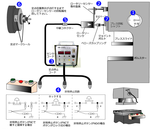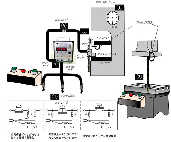 - ④定点停止コードをプレスの非常停止ボタンの非常停止回路に接続します。 ( 測定値がノイズによりバラツク場合は、定点停止コード接続部と並列にサージキラーを接続します。注:シーケンサー回路等でサージキラーを使用すると定点停止しない場合があります。)