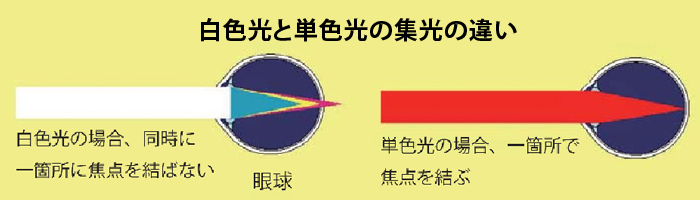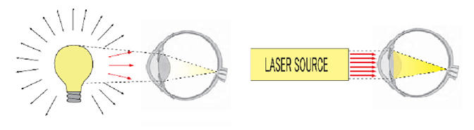 単色性に優れる一般電球等には様々な光(波長)が混じっており、眼に入った場合でも各波長の水晶体ででの屈折率が異なる為、焦点は1ヶ所では結ばれませんが、レーザ光は単一波長の為、エネルギー密度が高い上、水晶体で集光され、網膜の一点にさらに高密度のエネルギーが到達します。