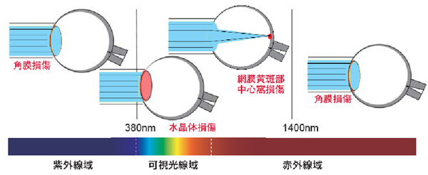 ※暴露されるレーザの波長によって傷害部位が異なる。