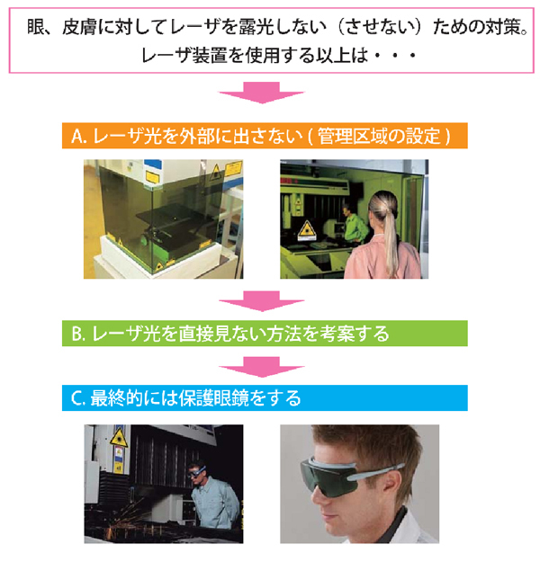 レーザ光には人が見る事が出来る可視光レーザと、人が見る事が出来ない不可視光レーザがあり、レーザ溶接、溶断、マーカなどの加工機に採用されているレー ザには、炭酸ガス(以下C02)やYAGなど不可視光レーザが多く、さらにハイパワーで危険なレーザもあります。またレーザ波長により眼の損傷部位が異な り、C02レー ザは角膜、YAGレーザは網膜が主に損傷します。眼が損傷した場合、回復機能が低いため永続的な視力障害に陥ってしまいます。
