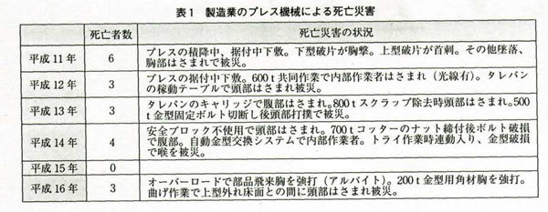 また、製造業のプレス機械による死亡災害の推移(表1)を見ると、平成15年以外は毎年数名がプレス機械で亡くなっており、大きな問題となっている。非定常作業での災害が多く見られるが、大型プレスやターレットパンチプレスでの被災も多い。プレス機械により毎年死亡災害が発生していることに対して、今後も真剣に対応していかなければならない。ここにおいても機械の包括安全基準の導入がきわめて重要になることは言うまでもない。
