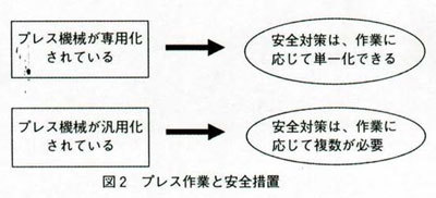 一つの安全対策としての完令なガードを継続的に使用できる環境があれば、この形をとることがベストである。中小企業のプレスエ場では、一台のプレスで多品種の作業を少量で生産していかなければならないので、それぞれの作業の内容に応じた安全装置・安全措置を複数に多用していかなければならない(図2)。