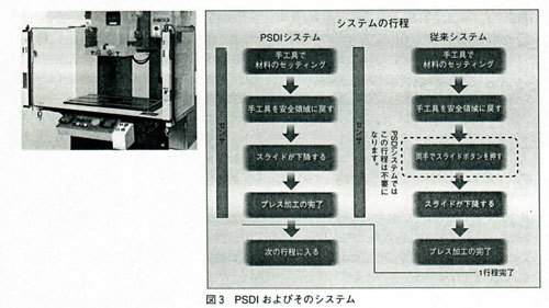 PSDIは「PresenceSensing Device Initiation」の頭文字をとった英語の省略語で安全装置によって機械を起動させるシステムのことである(図3)欧州規格レベルのガードを装備、押しボタンを押す手間を省き生産性が向上するということで普及し始めている。通常の光線式安令装置は、手が危険限界に入ると機械を停止させる機能(ガードオンリー機能)だけしか持っていないが、PSDIは、これに追加して手が危険限界からなくなるとボタンを押さなくても機械を動かすことができるという起動システムを併せ持ったものである。