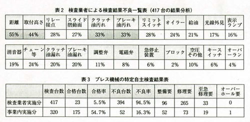 安全距離の不良や取付高さの不良が55%で半数を占め、クラッチブレーキの不具合などもかなり指摘されている(表2)。 残念ながらプレス特定自主検査結果表(表3)を見ると検査業者と事業内検査では結果が異なっていることがわかる。検査業者が実施した417台のうち、合格率が5.5%であるのに対し事業内検検査者が実施した320台の結果を見ると合格率が4.7%である。検査者のおかれている立場の違いを勘案したとしても問題の残る数字である。特定自主検査は健康診断ではあるが、病気と健康の差が医師によって大きく差が出てしまうのでは、検査レベルの差があると言わざるを得ない。事業内検査者のレベルを一段と向上させなければならない。能力向上教育(中災防にて実施中)を受講し、技術レベルを上げ、適正な検査を実施して欲しいものである。