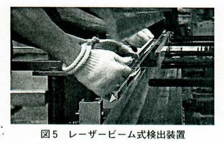 レーザービーム式検出装置は、光線の太い光軸とは異なり、極細のレーザー光線が微細なものを検知するので、指先の細かい動きを検知できるのが特徴である。プレスブレーキ作業の指先安全検出装置として使われている。スライドの高速加工の時点では光線式安全装置で検出し、加工する時の微加工速度の時に、このレーザービームを活用して作業を行うことができる。指の微細な動きも検知するので、光線とは異なった装置と考えられる。二次曲げには使えないことが多いが。一時曲げには効果を発抑している(図5)。