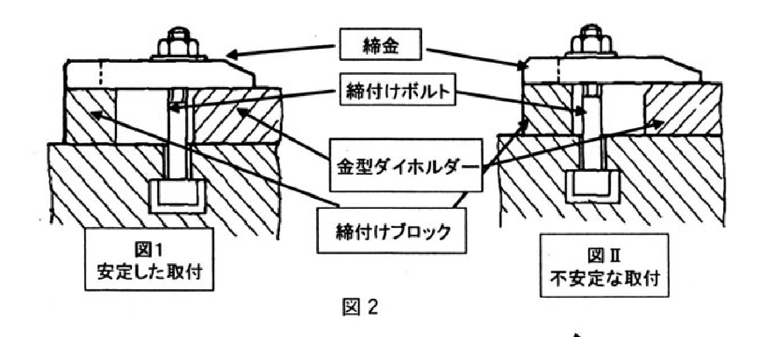 図2を比較した塀合、締付け力4トンを必要とする場合では、一般的に、締付けボルトの位置によって.金型ダイホルダーにかかる締付け力には大きな差がでてくる.図1の場合、なるべくダイホルダー側に近づけた状態では、締付け力はダイホルダー側に2.5トン.締付けブロックに1.5トンが加わリ、安定した状態になる.逆に図2の場合、締付け力はダイホルダー側に1.5トン.締付けブロックに2.5トンが加わり、不安定な状態になるといわれており、このことは充分考慮する必要がある。