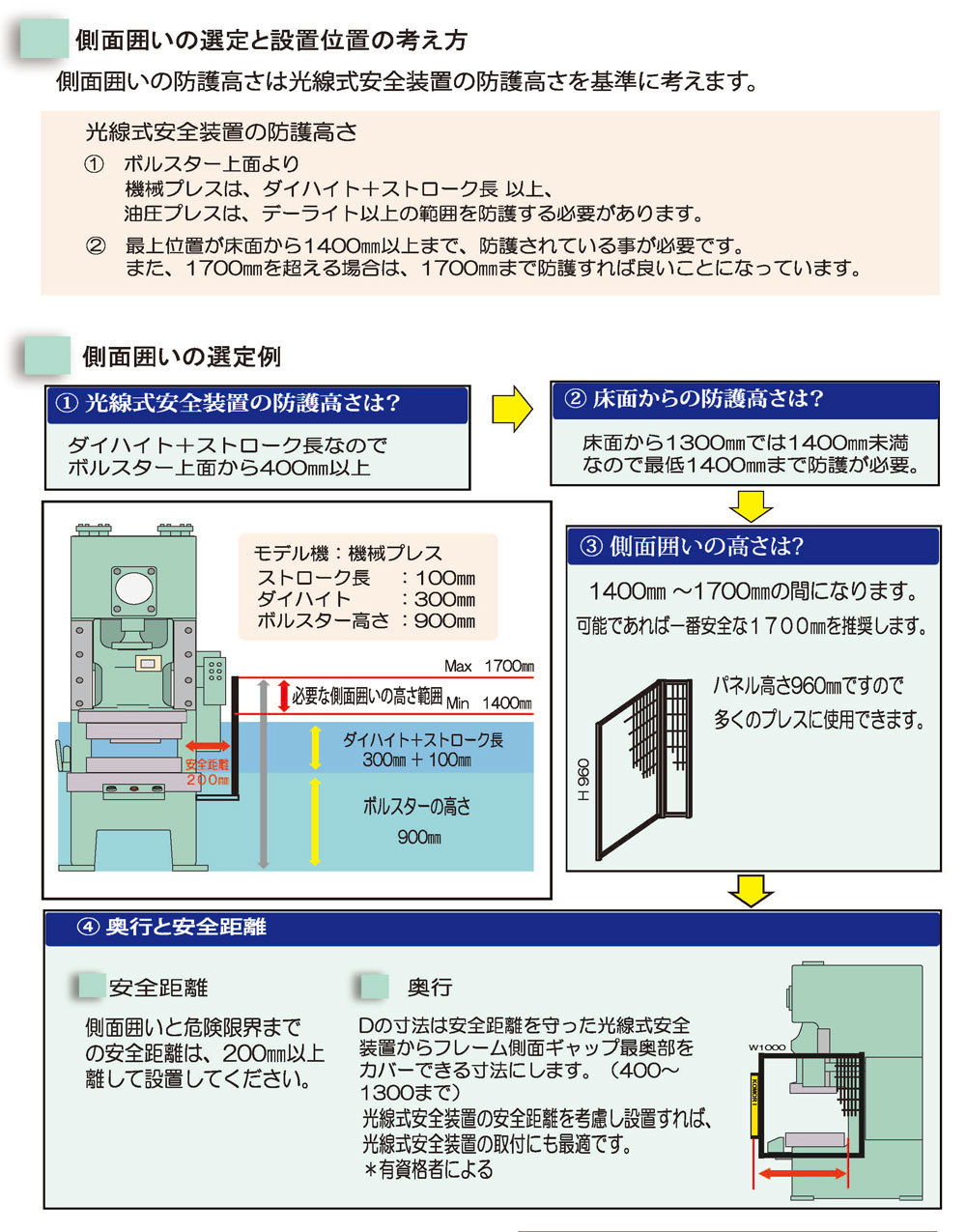プレスの作業面以外(側面や背面)の安全対策として、労働安全衛生法第20条、労働安全衛生規則第131条1項、通達(平成27年9月30日基発0930第12号)において義務付けられており、適合した動力プレス機械構造規格の新旧にかかわらず必要とされています。