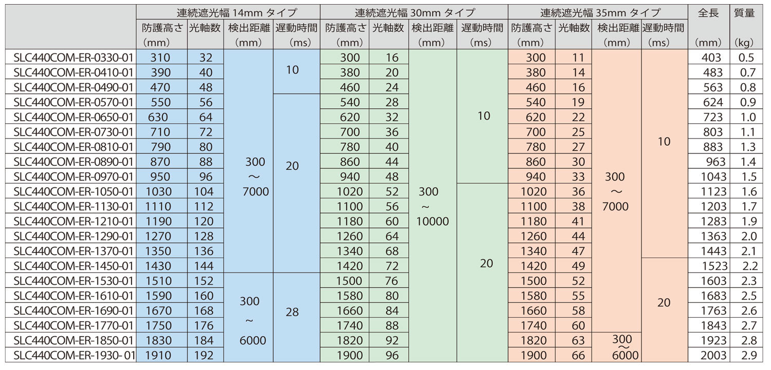 防護高さは330mm~1930mm、検出距離最大10m、連続遮光幅は14mm、30mm、35mmの3タイプ21サイズ、をご用意しています。