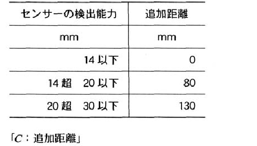 り込まれている。まず。従来の光線式安全装置は、一般的に光軸を遮り、危険を感知して停止させる危険確認型といわれている。しかし、このPSDI装置は、投受光式の安全確認型を採用していて、光線上に何もないことを確認し、動作可能としているため、安全性は反射式に比べて高いといえる。そのほか、光線式の光軸ピッチも日本の規格では。50 mm 以下のピッチとなっているが、国際安全規格では光軸ピッチによって安全距離の算出の仕方が異なっている。 その一例をみてみると、センサーの検出能力に応じて追加の安全距離が必要となる。