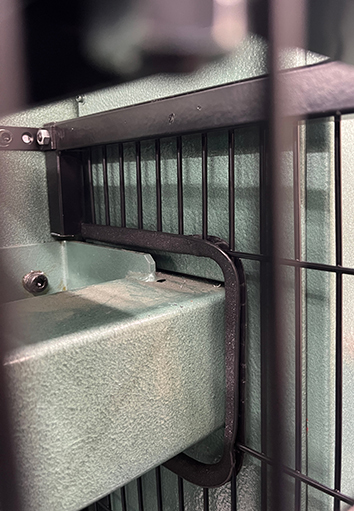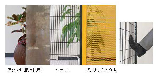 網目は縦ワイヤを通路(表)側に配し、網目に足を掛けてよじ登りにくい構造。パネルは内部が見やすい黒色で、内部の視認性可視性の高い色を採用。