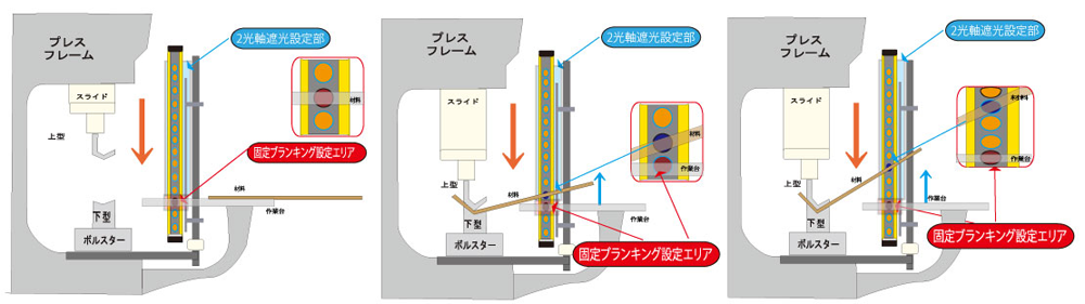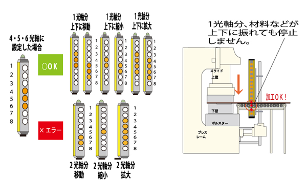 材料の挿入角度やたわみ等により、遮光する幅は変化します。また、手などが危険エリアに入れば、2光軸以上遮光されるので急停止します。小物・箱曲加工のないプレスブレーキなどにもお勧めです。