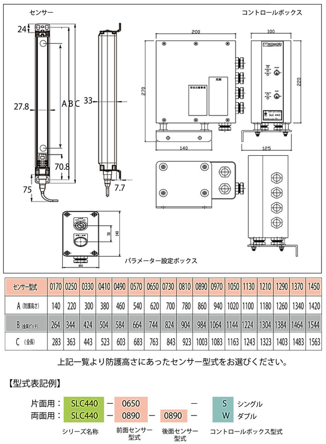 ご注文の際に下記一覧表より防護高さに合ったセンサーを選んで下さい。