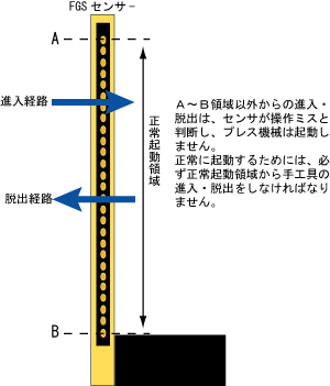 もちろん、誤って手を進入した場合は、検知してプレスを急停止させます。